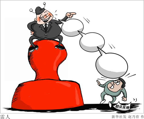 其二,遮丑關(guān)。“家丑不可外揚(yáng)”思維作祟,怕違法亂紀(jì)行為曝光影響地方形象而護(hù)短、包庇。在不少侵害群眾利益的行為中,一些政府部門(mén)或多或少充當(dāng)了幫兇。只要群眾忍氣吞聲,這些行為就不了了之。一旦群眾投訴引發(fā)輿論關(guān)注,當(dāng)?shù)卣ε缕毓庥绊懙胤叫蜗笊踔?ldquo;烏紗帽”,就派出各路人馬“游說(shuō)”。這些干部接待上訪群眾時(shí)先表示同情和理解,再以“大局意識(shí)”進(jìn)行說(shuō)教,最終提出賠錢(qián)了事。一旦“說(shuō)不通”,就“放狠話”“玩拖延”,甚至威脅。