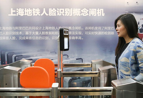 在上海申通地鐵集團有限公司,工作人員在現場體驗刷臉進站技術(2017年12月5日攝)。新華社記者 丁汀 攝