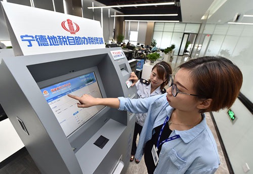 寧德時代新能源科技有限公司的員工在辦稅員的指導下試用自助辦稅終端(2017年10月12日攝)。新華社記者 宋為偉 攝