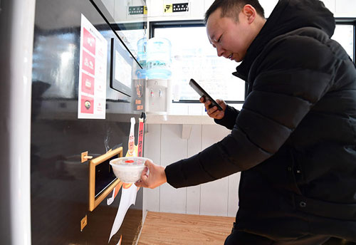 在位于西安曲江創客大街邊的一家無人面館內,市民用手機拍攝機器剛做好的面食(1月10日攝)。新華社記者 邵瑞 攝