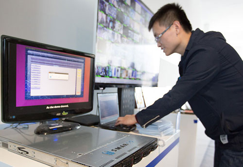 在北京智能計算產業研究院舉行的發布會上,工作人員在現場演示高通量人工智能一體機的實際應用(2017年12月6日攝)。新華社記者 金立旺 攝
