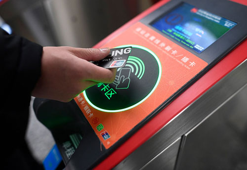 乘客在杭州地鐵豐潭路站體驗使用帶有閃付功能的銀聯IC卡過閘乘車(2017年12月27日攝)。新華社記者 黃宗治 攝