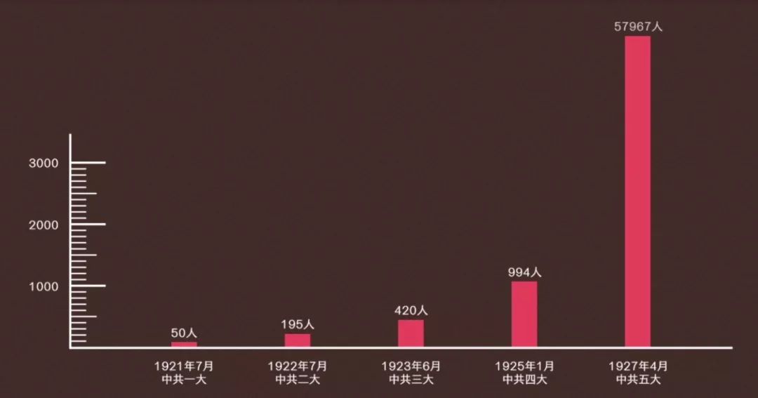 1925年全國黨員人數不到1000人,到1927年5月,黨的五大召開時,全國黨員人數已經達到5.8萬人。