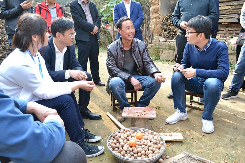 ▲ 核桃種植戶李現法(右二),向河南省商務廳電子商務辦公室副主任韓玉舟(左二),蘇寧鄭州地區管理中心副總經理趙冬利(左一)介紹今年核桃的收成